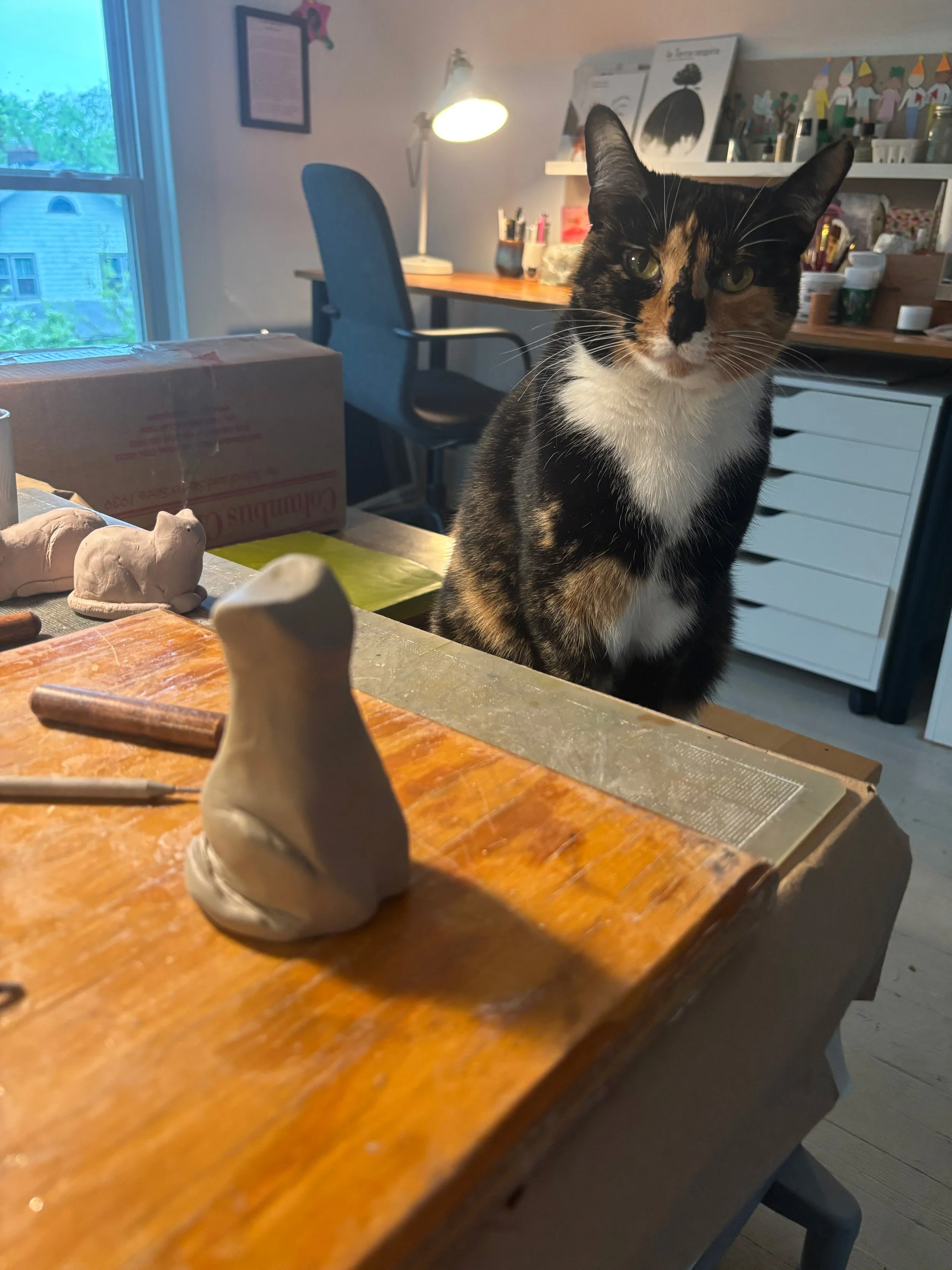 As the months passed, I kept looking at my clay cats and wondering if there could be more to these? I started to imagine the clay cats congregating with other cat friends. I heard little kitty conversations in my head and I imagined stories as well. I am always talking to my own cat Juno (see the sassy attitude above) and I’d venture to say that anyone living with a cat knows how the cat conversations can be an endless source of silliness.